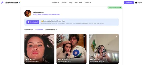 DolphinRadar allows users to download public Instagram content for offline viewing. This includes posts, stories, and highlights - perfect for saving inspiration, creating mood boards, or archiving content for later reference.