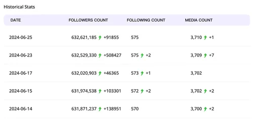 According to DolphinRadar's monitoring, Ronaldo's Instagram account exhibits remarkable growth. On average, he gains 118,622 followers daily. The start of the 2024 European Cup has further accelerated this growth. For instance, on June 7, 2024, the account saw an extraordinary increase of 559,909 followers in just one day.