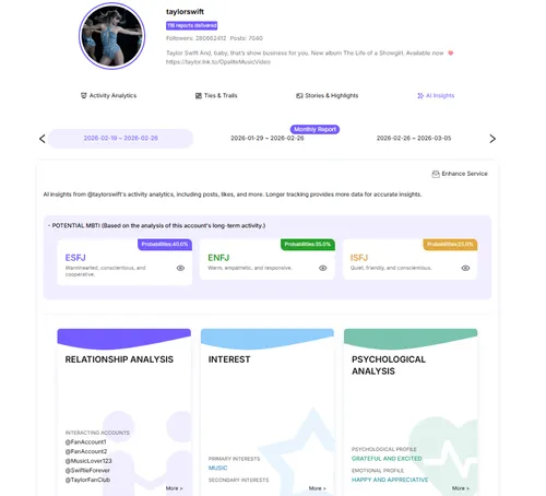You get a weekly or monthly report listing every post someone liked, plus interest tags, top accounts they engaged with, and some basic follow stats. Reports land in your email and show up on a dashboard. There's also an AI summary that tries to sketch out the person's personality based on their like patterns, topics of interest, and things like that.
