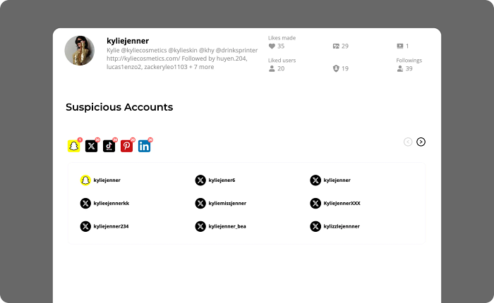 Dolphin Radar helps you identify potential suspicious accounts linked to your ex’s Instagram profile across Twitter, LinkedIn, Pinterest, TikTok, and Snapchat.