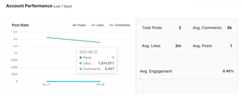 In this report, more than 73% of comments were positive, while around 27% were neutral. None showed negativity. Alongside this, the tool tracked account activity, showing metrics such as posting frequency, average likes, comments per post, and engagement rate.