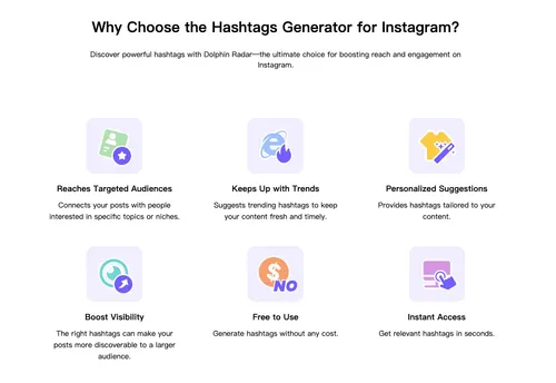 One of the most effective tools for finding relevant and trending hashtags is DolphinRadar’s Hashtag Generator. This tool helps you generate hashtags specifically tailored to your content, ensuring that you reach the right audience and maximize engagement.