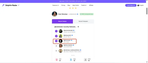 Using DolphinRadar’s “recent follow” tracker, we confirmed that Mayer’s account now appears on her list of new connections.