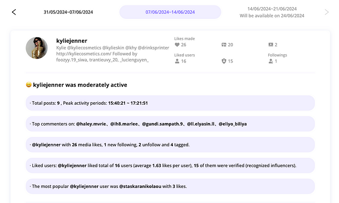 Here’s an example of an activity report for Kylie Jenner’s Instagram: Kylie Jenner Activity Report.